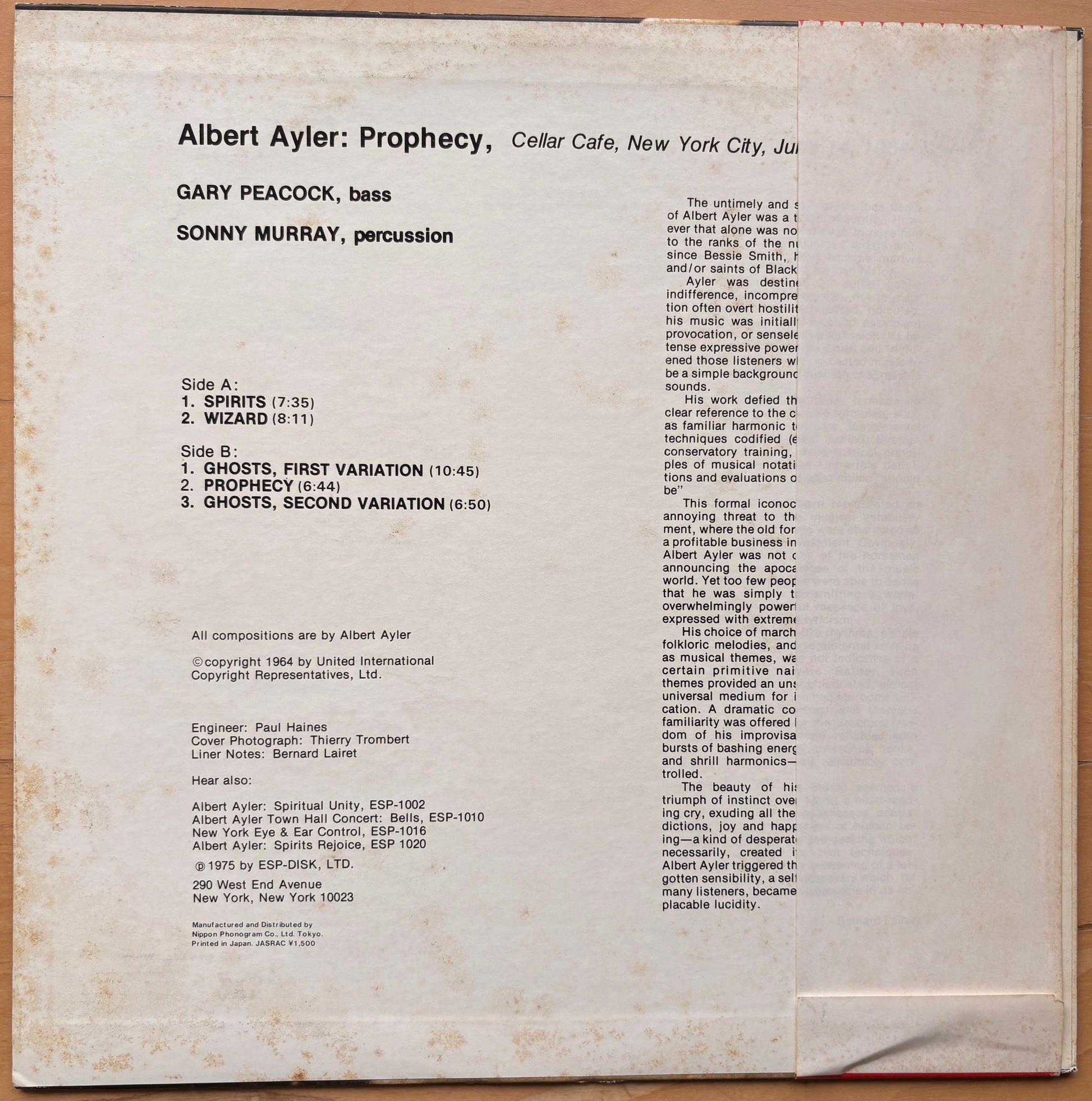 ALBERT AYLER: "Prophecy" (ESP Disk/ Nippon Phonogram - 15PJ-2020) Record: Near Mint/ Jacket: VG++ no defects but some foxing spots visible/ Obi: Excellent
