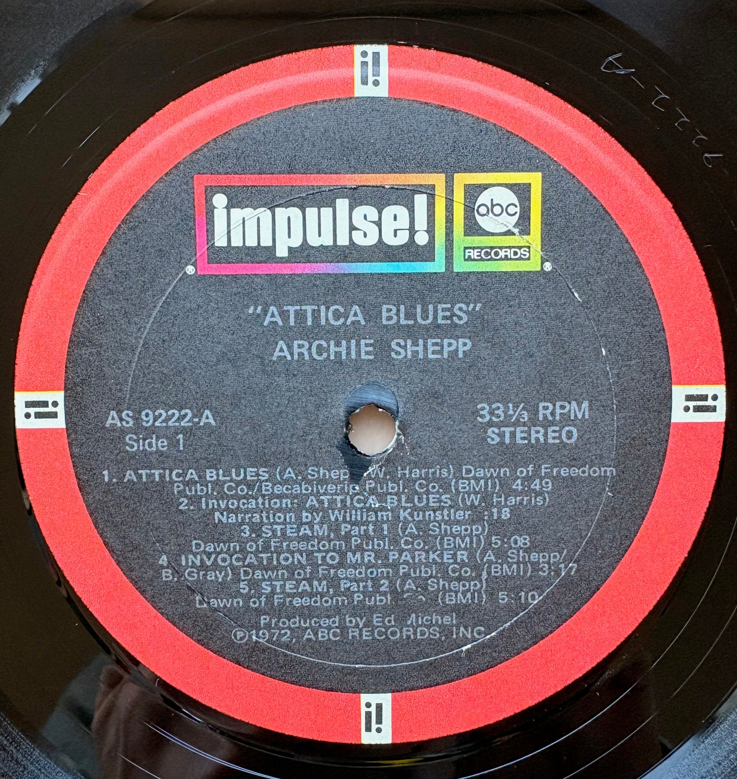 ARCHIE SHEPP: "Attica Blues" (Impulse - AS-9222) ----- Record: Near Mint/ Gatefold Jacket: Excellent ~ Near Mint - sole defect is upper left corner perforation hole - no splits no foxing no damages - Company Inner Sleeve: Excellent
