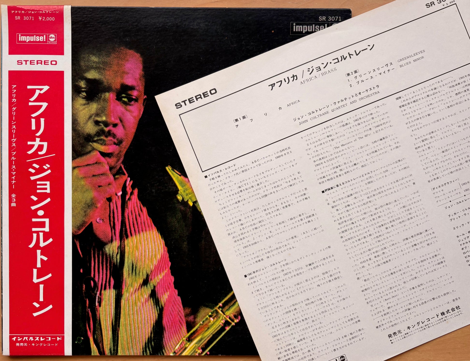 JOHN COLTRANE: "Africa/ Brass" (Impulse - SR-3071) Record: Near mint/ Gatefold Jacket: Excellent with date annotation inside gatefold lower right corner/ Insert: Near Mint/ Obi: Excellent