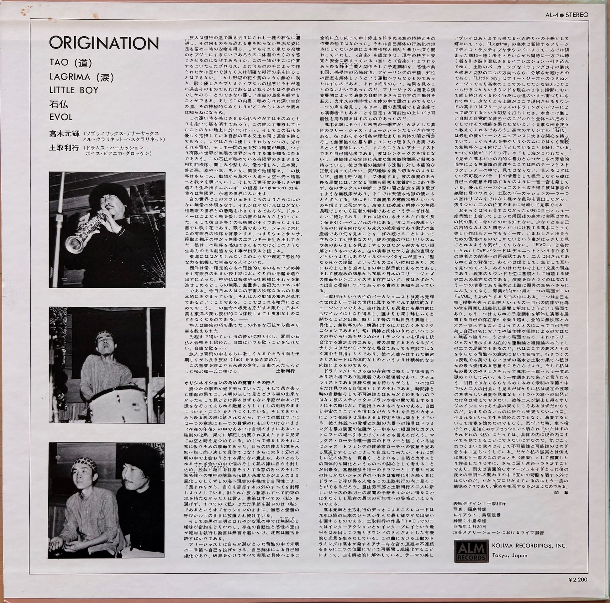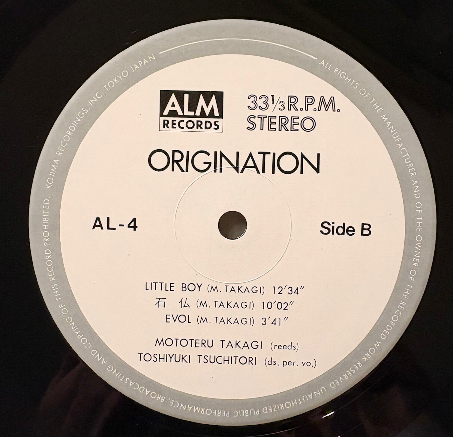 TAKAGI MOTOTERU & TOSHIYUKI TSUCHITORI: "Origination" (ALM Records - AL-4) ----- Record: Near Mint/ Jacket: Excellent ~ Near Mint - faint discolouration on spine